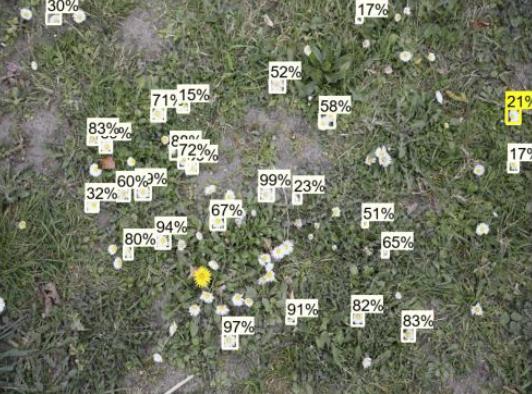 In data preparation, it became quite challenging. We can immediately see in a photo that there are flowers, but an AI does not know whether a cluster of flowers is one or more flowers, or whether two yellow flowers are different species. The data had to be prepared manually, Filip explains: "Your data has to be readable, so your model has to learn what is a flower then. We received 11Gb of image material, supplied by the research group. A number of photos were manually annotated, so-called bounding boxes. In fact, these are manual cut-outs that make it possible for the model to read where in the image the flowers are to be found. This is a labor of love, so on the advice of our supervisor, we looked into methods of automating this. Applying colour filtering, for example by making all the green invisible, made this a faster process."
